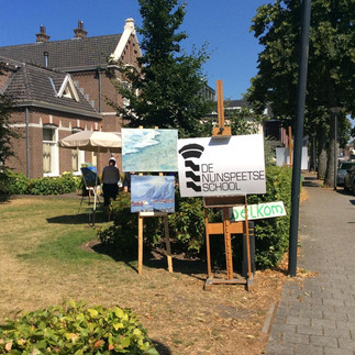 Het is inmiddels traditie om tijdens de Nunspeetse Zomermarkten met de Kunstkring Nunspeet buiten te gaan werken. Ooit begonnen in de tuin naast de Vrije Academie, daarna enkele jaren bij Dutch Hair en bij de Dorpskerk. Dit jaar hebben we in 2024 weer gekozen terug naar de tuin te gaan waar het allemaal is begonnen. Vandaar de titel "Kunst Weer in de Tuin".